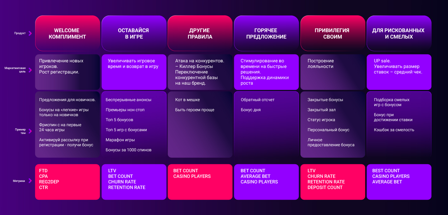 Чтобы предложения не превращались в хаотичную «чёрную дыру бонусов», мы выстроили систему связей между бонусами, бизнес-целями и потребностями игрков. Это позволяет точнее управлять предложением, усиливать вовлечённость и увеличивать ценность для игроков.